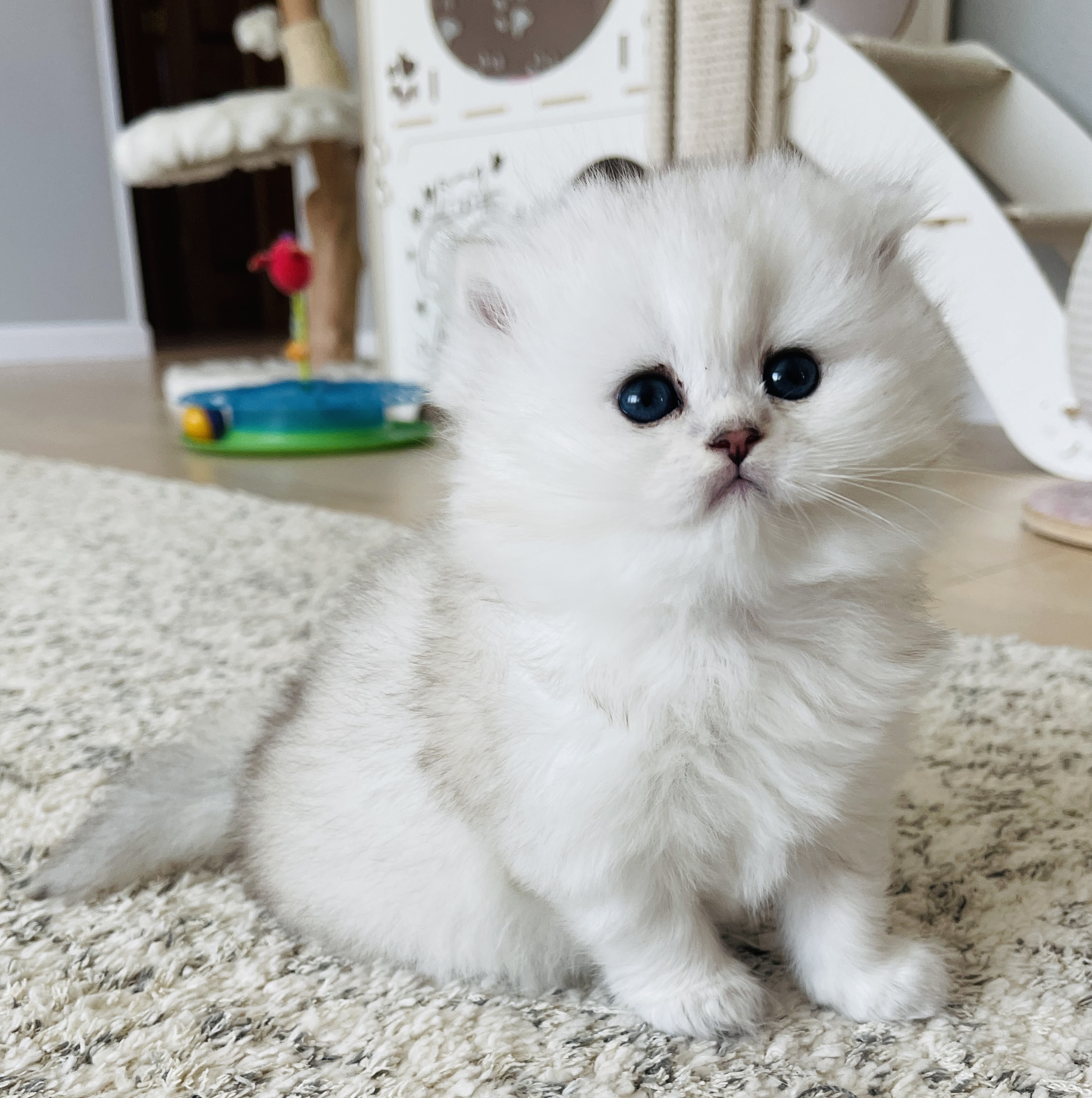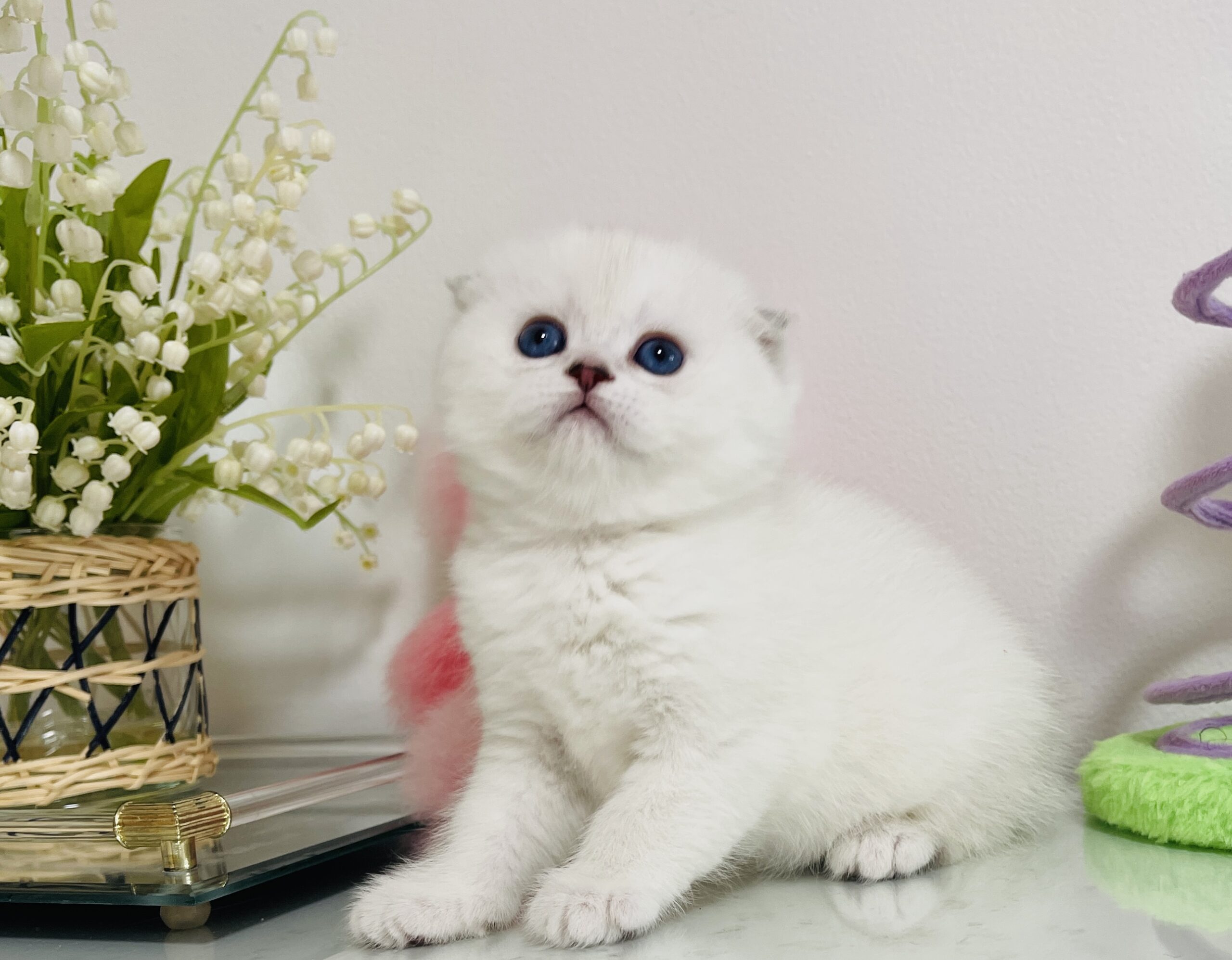 We have two adorable kittens in our cattery right now: a longhair Scottish Fold boy and a shorthair girl. They are only one month old and not ready for their new homes yet.